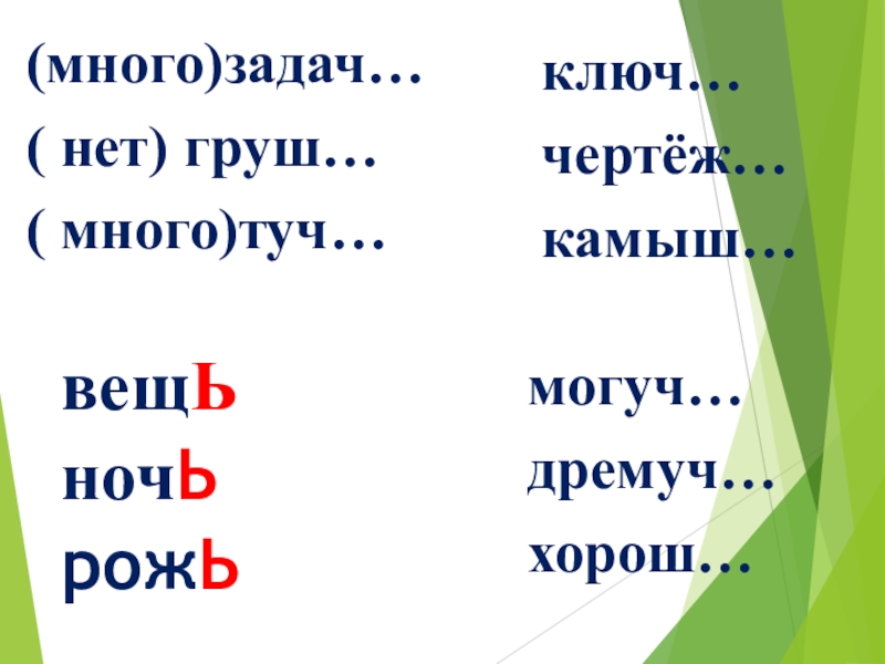 (много)задач…( нет) груш…( много)туч…ключ…чертёж…камыш…вещЬночЬрожЬмогуч…дремуч…хорош…