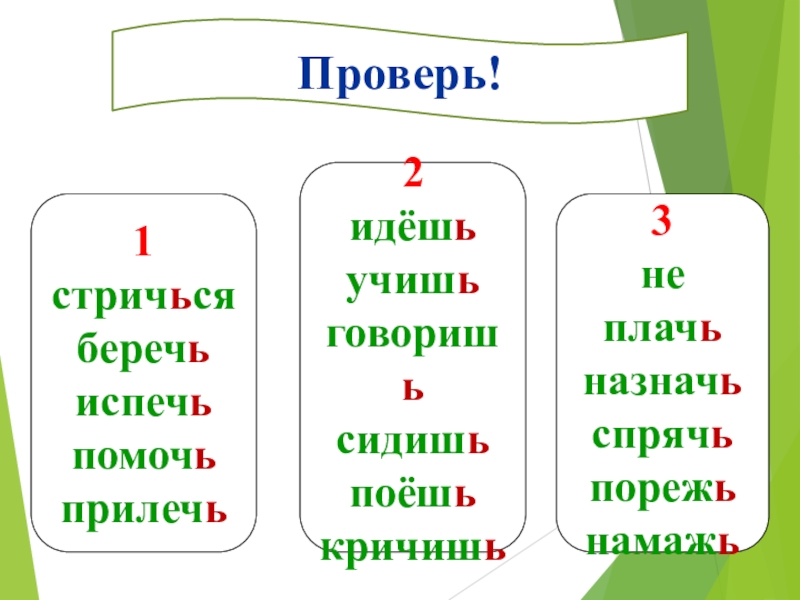 1 стричьсяберечьиспечьпомочьприлечь2 идёшьучишьговоришьсидишьпоёшь кричишь3 не плачьназначьспрячь порежьнамажьПроверь!