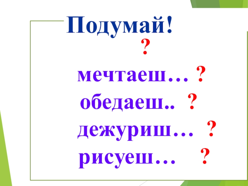 ? мечтаеш… ?обедаеш.. ?  дежуриш… ? рисуеш…  ?Подумай!