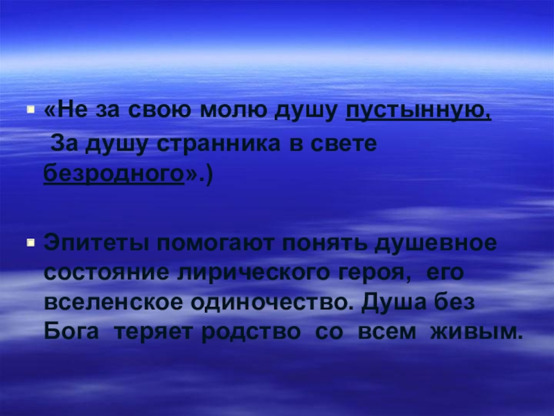 Эпитеты помогают понять душевное состояние лирического героя, его вселенское одиночество. Душа без Бога теряет родство со всем живым.