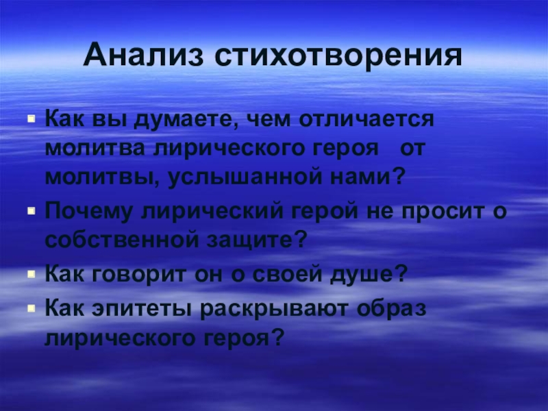 лирический герой обращается к Богу, Божией Матери, ставит важнейшие вопросы бытия и находит ответы на них в Богообщении.