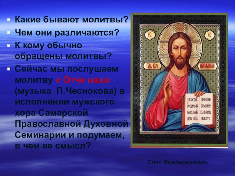 молитву « Отче наш» (музыка П.Чеснокова) в исполнении мужского хора Самарской Православной Духовной Семинарии и подумаем, в чем ее смысл?