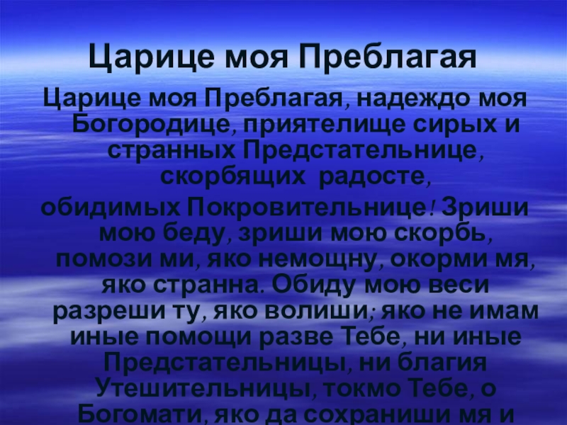 обидимых Покровительнице! Зриши мою беду, зриши мою скорбь, помози ми, яко немощну, окорми мя, яко странна. Обиду мою веси разреши ту, яко волиши; яко не имам иные помощи разве Тебе, ни иные Предстательницы, ни благия Утешительницы, токмо Тебе, о Богомати, яко да сохраниши мя и покрыеши во веки веков.