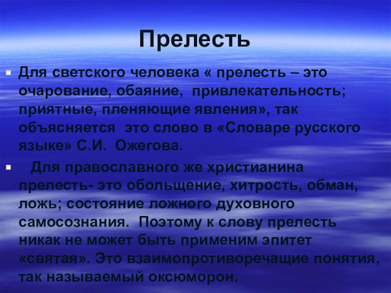 Для православного же христианина прелесть- это обольщение, хитрость, обман, ложь; состояние ложного духовного самосознания. Поэтому к слову прелесть никак не может быть применим эпитет «святая». Это взаимопротиворечащие понятия, так называемый оксюморон.