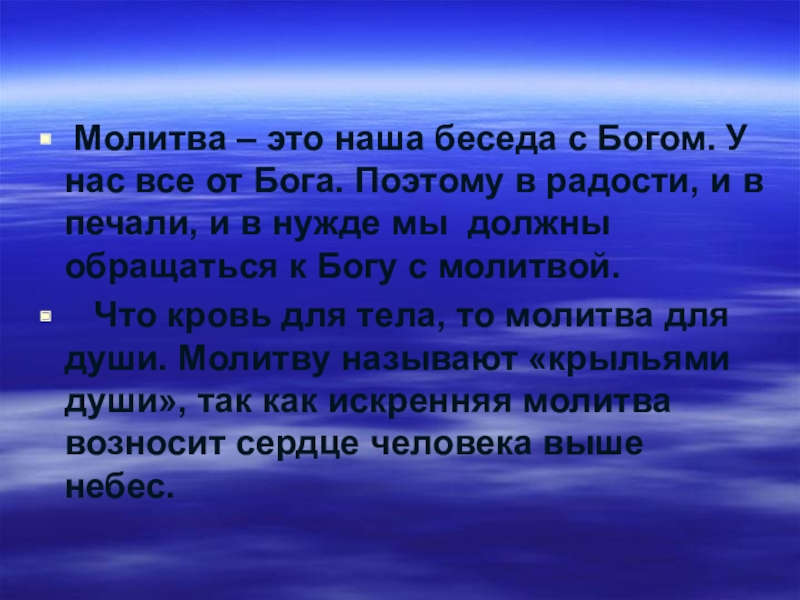 Что кровь для тела, то молитва для души. Молитву называют «крыльями души», так как искренняя молитва возносит сердце человека выше небес.