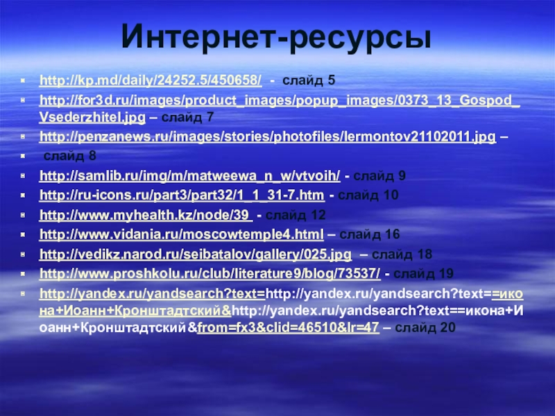 http://yandex.ru/yandsearch?text=http://yandex.ru/yandsearch?text==икона+Иоанн+Кронштадтский&http://yandex.ru/yandsearch?text==икона+Иоанн+Кронштадтский&from=fx3&clid=46510&lr=47 – слайд 20
