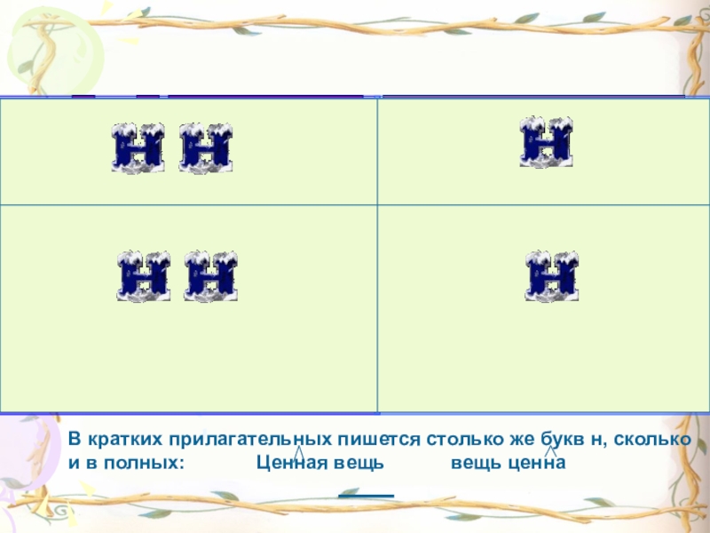 В кратких прилагательных пишется столько же букв н, сколько и в полных: Ценная вещь вещь ценна
