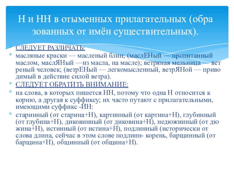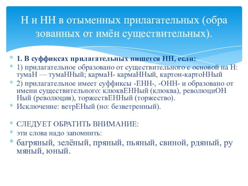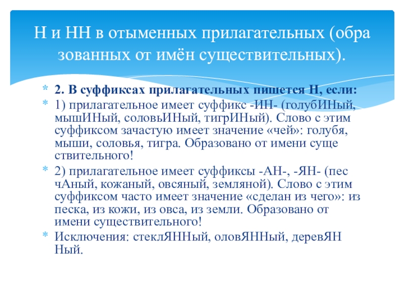 Н и НН в отыменных прилагательных (образованных от имён существительных).