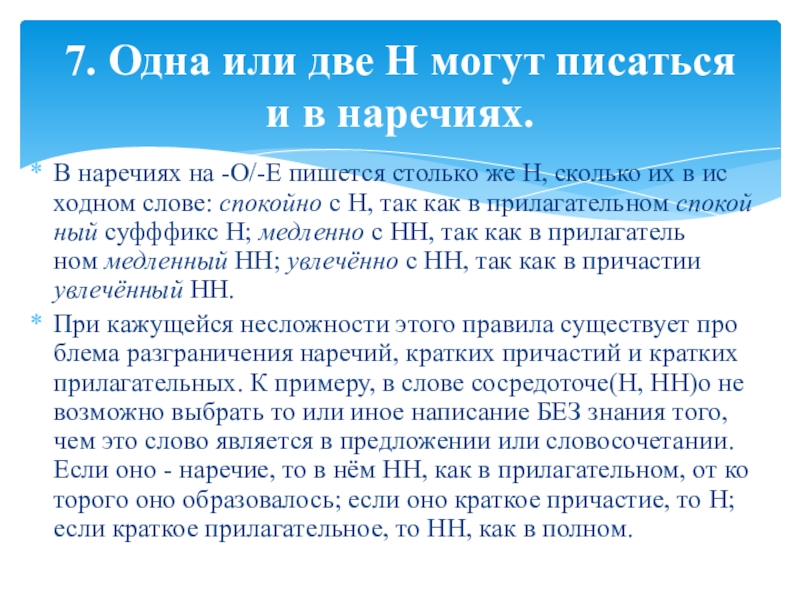 7. Одна или две Н могут писаться и в наречиях.