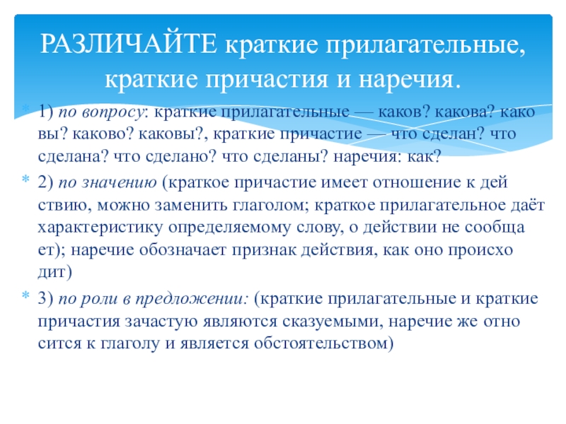 РАЗЛИЧАЙТЕ краткие прилагательные, краткие причастия и наречия.