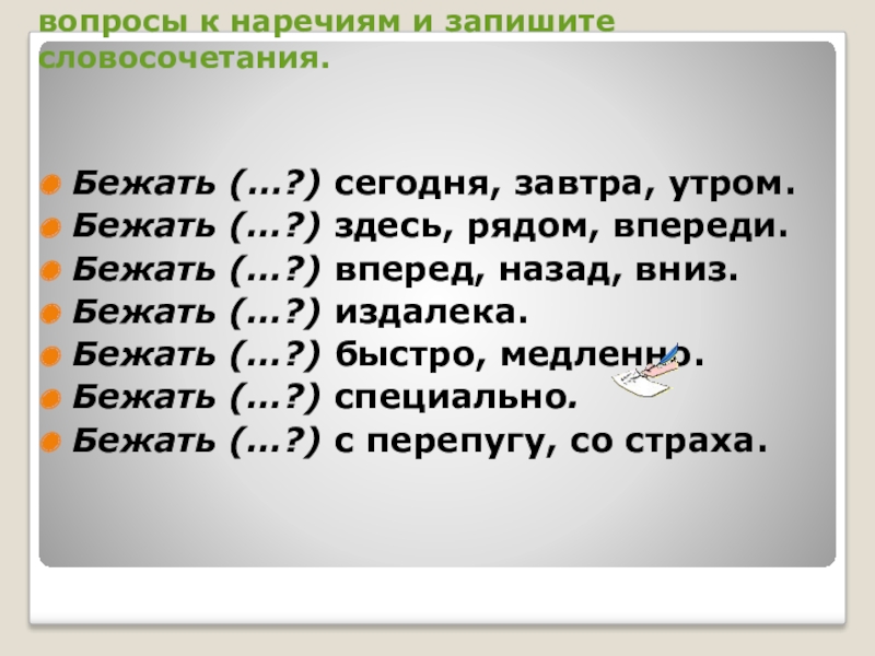 Слайд 5Задание. От глагола бежать поставьте вопросы к наречиям и запишите словосочетания.