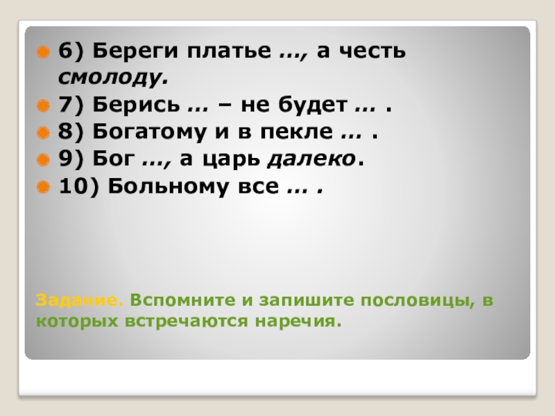 Слайд 8Задание. Вспомните и запишите пословицы, в которых встречаются наречия.