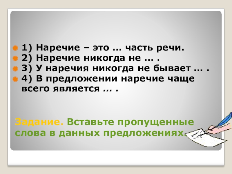 Слайд 4Задание. Вставьте пропущенные слова в данных предложениях.