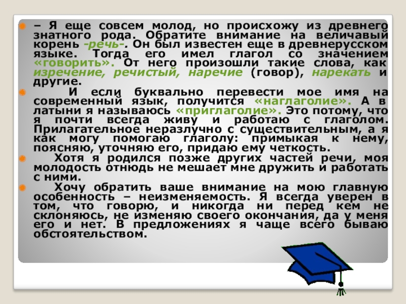 И если буквально перевести мое имя на современный язык, получится «наглаголие». А в латыни я называюсь «приглаголие». Это потому, что я почти всегда живу и работаю с глаголом. Прилагательное неразлучно с существительным, а я как могу помогаю глаголу: примыкая к нему, поясняю, уточняю его, придаю ему четкость.