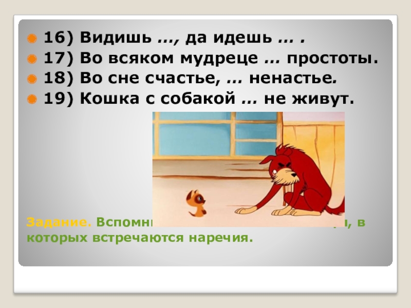 Слайд 7Задание. Вспомните и запишите пословицы, в которых встречаются наречия.