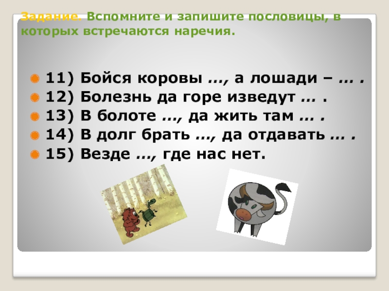 Слайд 9Задание. Вспомните и запишите пословицы, в которых встречаются наречия.