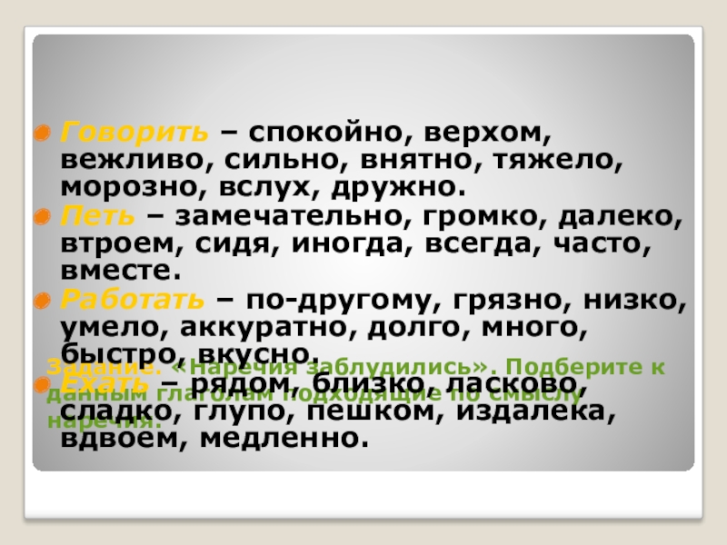 Слайд 6Задание. «Наречия заблудились». Подберите к данным глаголам подходящие по смыслу наречия.