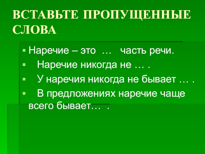 ВСТАВЬТЕ ПРОПУЩЕННЫЕ СЛОВА Наречие – это …  часть речи.  Наречие никогда не … .
