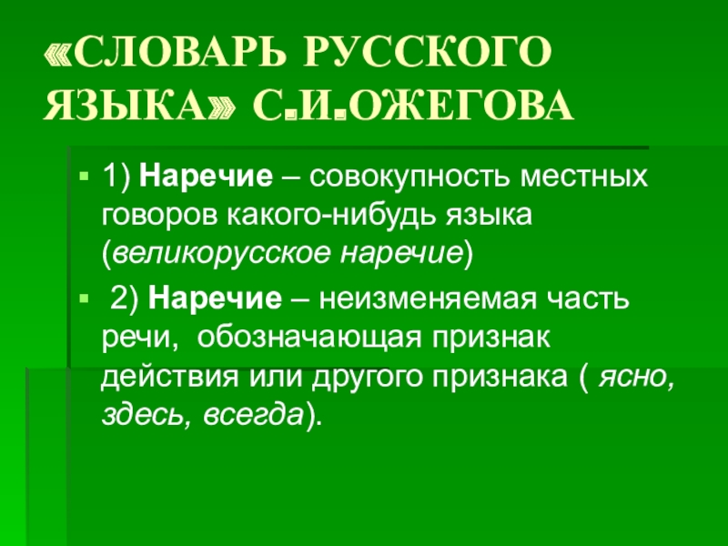 «СЛОВАРЬ РУССКОГО ЯЗЫКА» С.И.ОЖЕГОВА 1) Наречие – совокупность местных говоров какого-нибудь языка (великорусское наречие) 2) Наречие – неизменяемая часть речи, обозначающая признак действия или другого признака ( ясно, здесь, всегда).