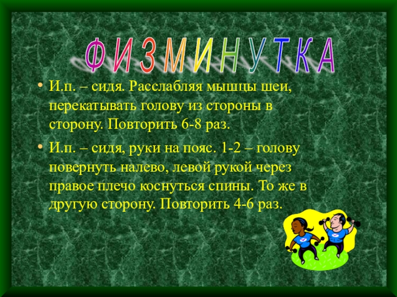 И.п. – сидя. Расслабляя мышцы шеи, перекатывать голову из стороны в сторону. Повторить 6-8 раз.