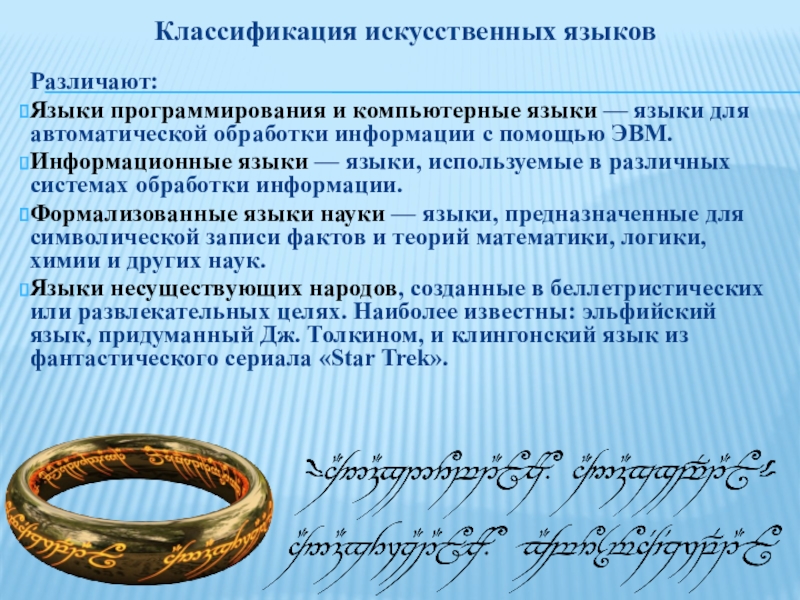 Языки несуществующих народов, созданные в беллетристических или развлекательных целях. Наиболее известны: эльфийский язык, придуманный Дж. Толкином, и клингонский язык из фантастического сериала «Star Trek».