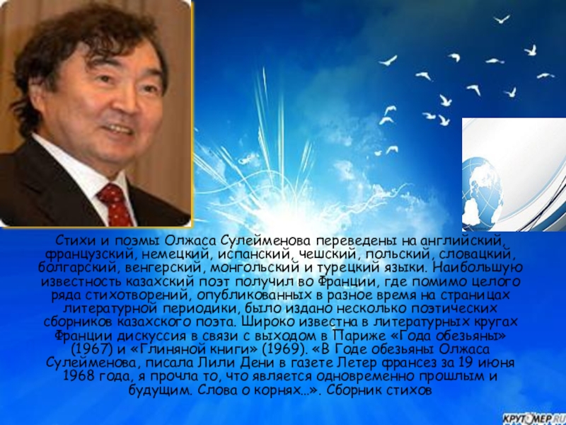 Слайд 17Стихи и поэмы Олжаса Сулейменова переведены на английский, французский, немецкий, испанский,