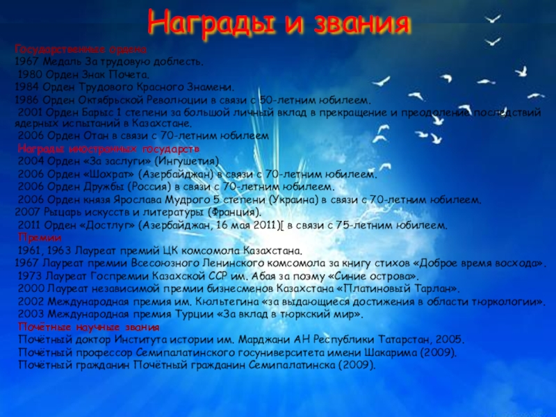 1973 Лауреат Госпремии Казахской ССР им. Абая за поэму «Синие острова».