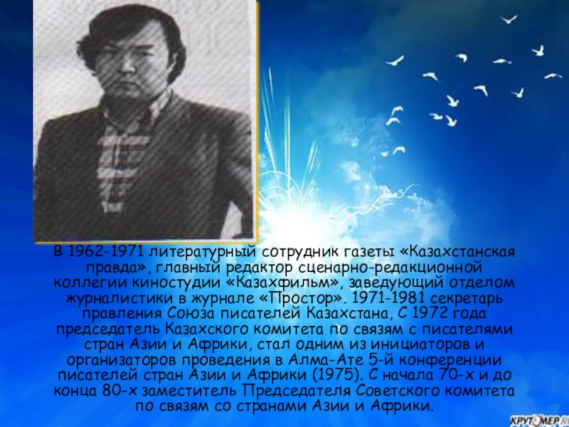 Слайд 6В 1962-1971 литературный сотрудник газеты «Казахстанская правда», главный редактор сценарно-редакционной коллегии