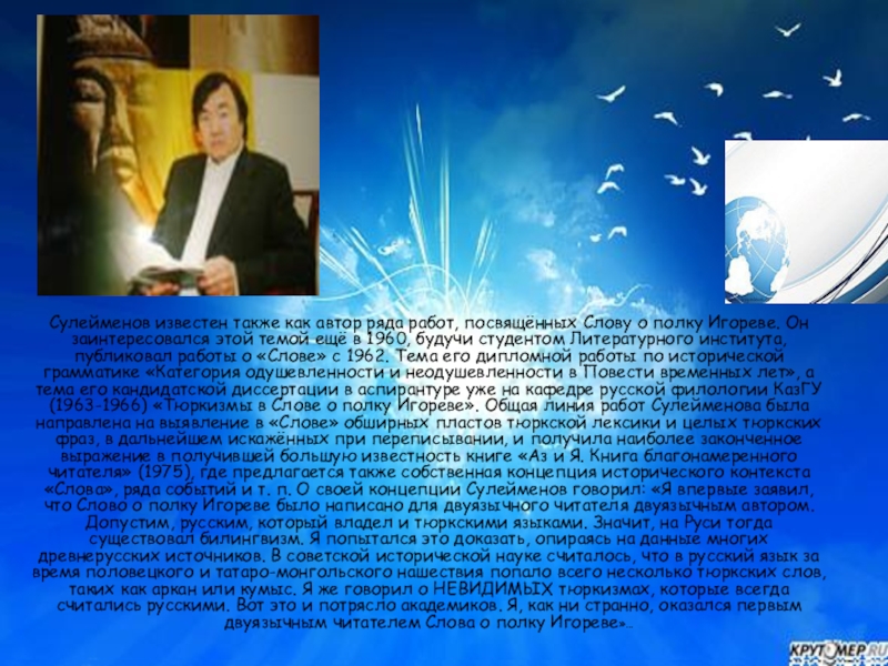 Слайд 13Сулейменов известен также как автор ряда работ, посвящённых Слову о полку