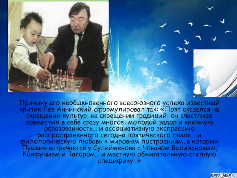 Слайд 11Олжаса Сулейменова причисляют к поэтам- шестидесятникам, его друзьями были три столпа