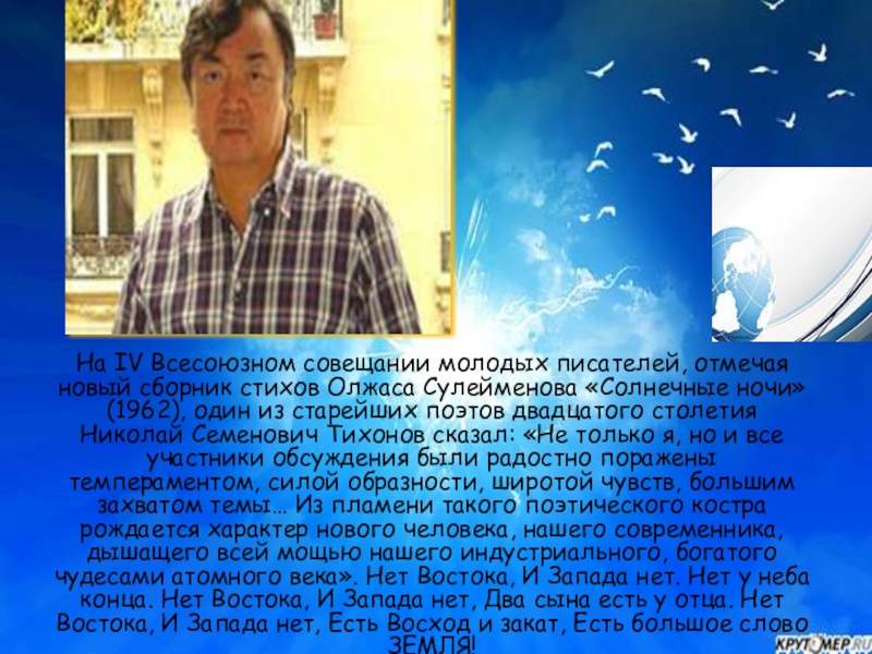Сулейменова «Солнечные ночи» (1962), один из старейших поэтов двадцатого столетия Николай Семенович Тихонов сказал: «Не только я, но и все участники обсуждения были радостно поражены темпераментом, силой образности, широтой чувств, большим захватом темы… Из пламени такого поэтического костра рождается характер нового человека, нашего современника, дышащего всей мощью нашего индустриального, богатого чудесами атомного века». Нет Востока, И Запада нет. Нет у неба конца. Нет Востока, И Запада нет, Два сына есть у отца. Нет Востока, И Запада нет, Есть Восход и закат, Есть большое слово ЗЕМЛЯ!