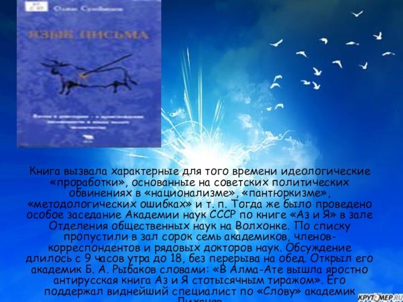 политических обвинениях в «национализме», «пантюркизме», «методологических ошибках» и т. п. Тогда же было проведено особое заседание Академии наук СССР по книге «Аз и Я» в зале Отделения общественных наук на Волхонке. По списку пропустили в зал сорок семь академиков, членов- корреспондентов и рядовых докторов наук. Обсуждение длилось с 9 часов утра до 18, без перерыва на обед. Открыл его академик Б. А. Рыбаков словами: «В Алма-Ате вышла яростно антирусская книга Аз и Я стотысячным тиражом». Его поддержал виднейший специалист по «Слову» академик Лихачев