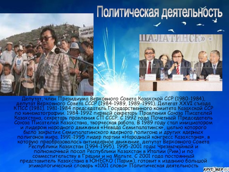 Слайд 10Депутат, член Президиума Верховного Совета Казахской ССР (1980-1984), депутат Верховного Совета