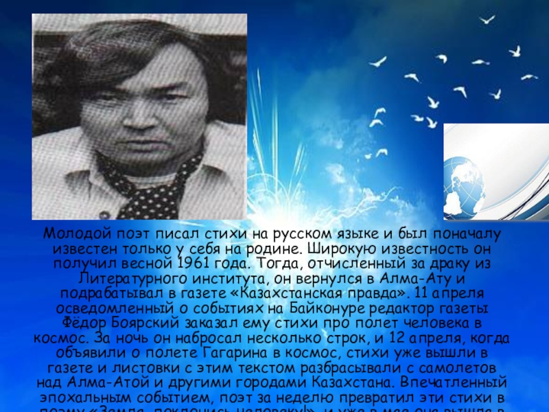 только у себя на родине. Широкую известность он получил весной 1961 года. Тогда, отчисленный за драку из Литературного института, он вернулся в Алма-Ату и подрабатывал в газете «Казахстанская правда». 11 апреля осведомленный о событиях на Байконуре редактор газеты Фёдор Боярский заказал ему стихи про полет человека в космос. За ночь он набросал несколько строк, и 12 апреля, когда объявили о полете Гагарина в космос, стихи уже вышли в газете и листовки с этим текстом разбрасывали с самолетов над Алма-Атой и другими городами Казахстана. Впечатленный эпохальным событием, поэт за неделю превратил эти стихи в поэму «Земля, поклонись человеку!», и уже в мае она вышла в свет.