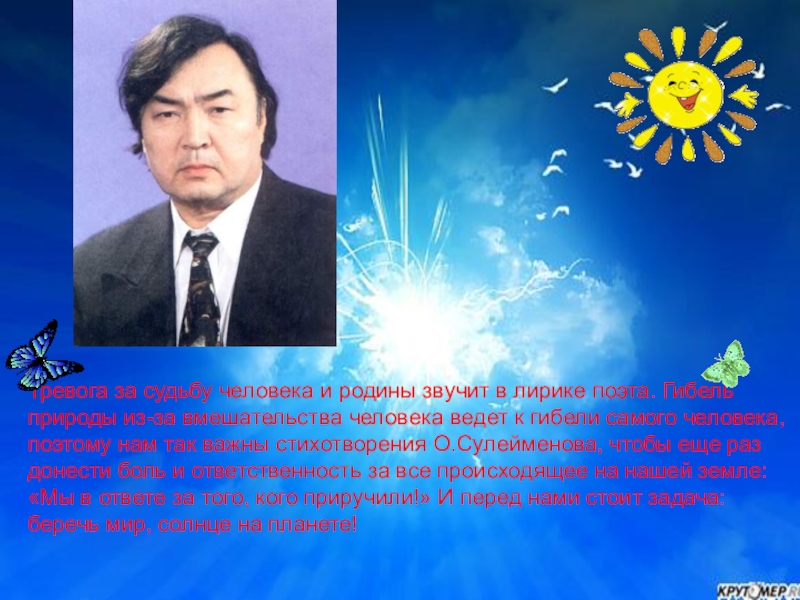Гибель природы из-за вмешательства человека ведет к гибели самого человека, поэтому нам так важны стихотворения О.Сулейменова, чтобы еще раз донести боль и ответственность за все происходящее на нашей земле: «Мы в ответе за того, кого приручили!» И перед нами стоит задача: беречь мир, солнце на планете!