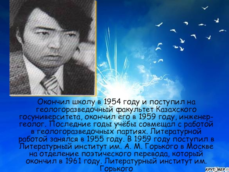 Слайд 5Окончил школу в 1954 году и поступил на геологоразведочный факультет Казахского