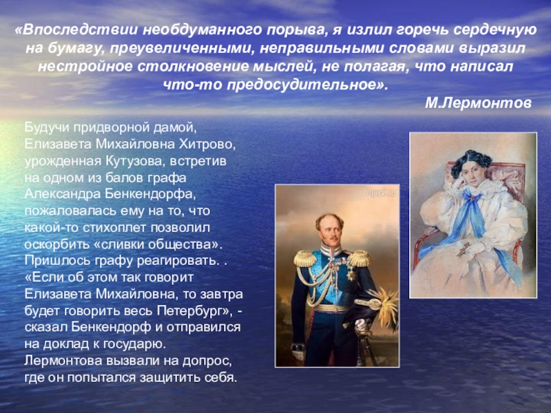 Будучи придворной дамой, Елизавета Михайловна Хитрово, урожденная Кутузова, встретив на одном из балов графа Александра Бенкендорфа, пожаловалась ему на то, что какой-то стихоплет позволил оскорбить «сливки общества». Пришлось графу реагировать. . «Если об этом так говорит Елизавета Михайловна, то завтра будет говорить весь Петербург», - сказал Бенкендорф и отправился на доклад к государю.