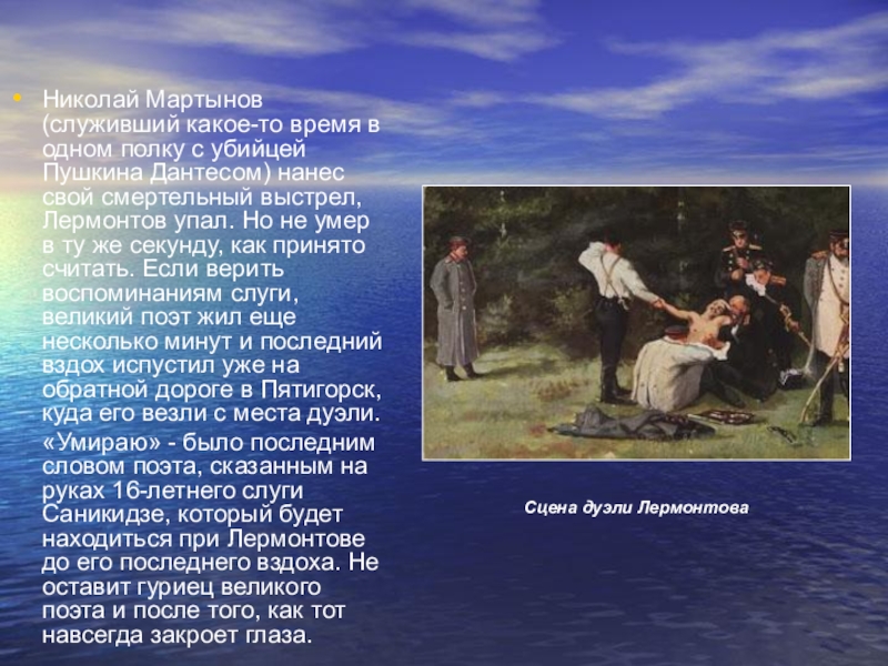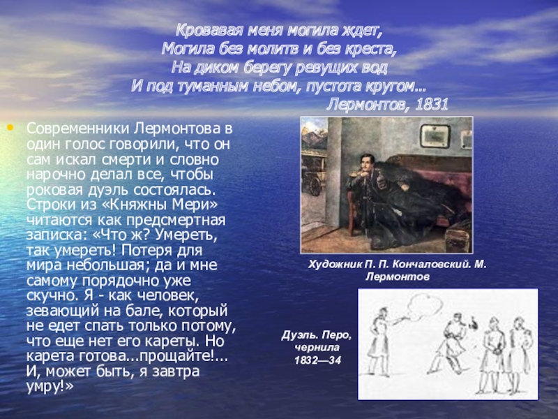 Современники Лермонтова в один голос говорили, что он сам искал смерти и словно нарочно делал все, чтобы роковая дуэль состоялась. Строки из «Княжны Мери» читаются как предсмертная записка: «Что ж? Умереть, так умереть! Потеря для мира небольшая; да и мне самому порядочно уже скучно. Я - как человек, зевающий на бале, который не едет спать только потому, что еще нет его кареты. Но карета готова...прощайте!... И, может быть, я завтра умру!»
