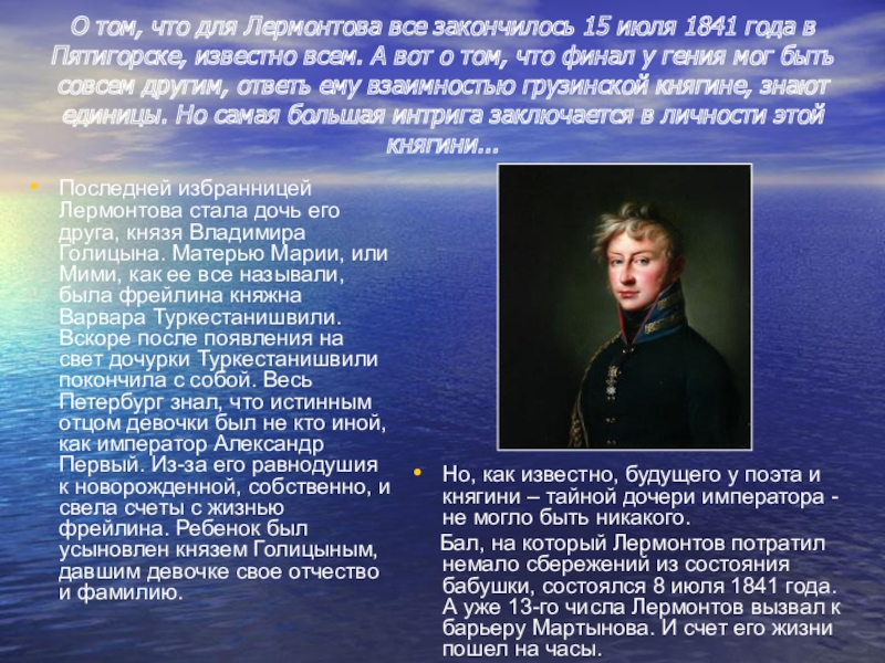 Последней избранницей Лермонтова стала дочь его друга, князя Владимира Голицына. Матерью Марии, или Мими, как ее все называли, была фрейлина княжна Варвара Туркестанишвили. Вскоре после появления на свет дочурки Туркестанишвили покончила с собой. Весь Петербург знал, что истинным отцом девочки был не кто иной, как император Александр Первый. Из-за его равнодушия к новорожденной, собственно, и свела счеты с жизнью фрейлина. Ребенок был усыновлен князем Голицыным, давшим девочке свое отчество и фамилию.