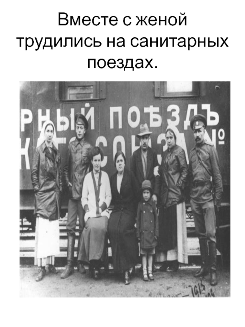 Слайд 8Вместе с женой трудились на санитарных поездах.