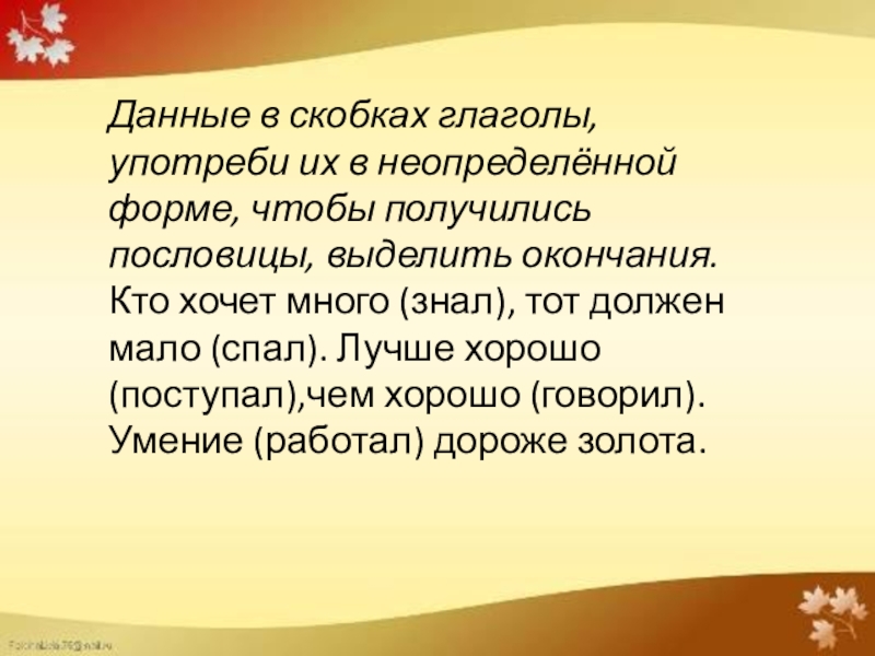 Данные в скобках глаголы, употреби их в неопределённой форме, чтобы получились пословицы, выделить окончания.Кто хочет много (знал),