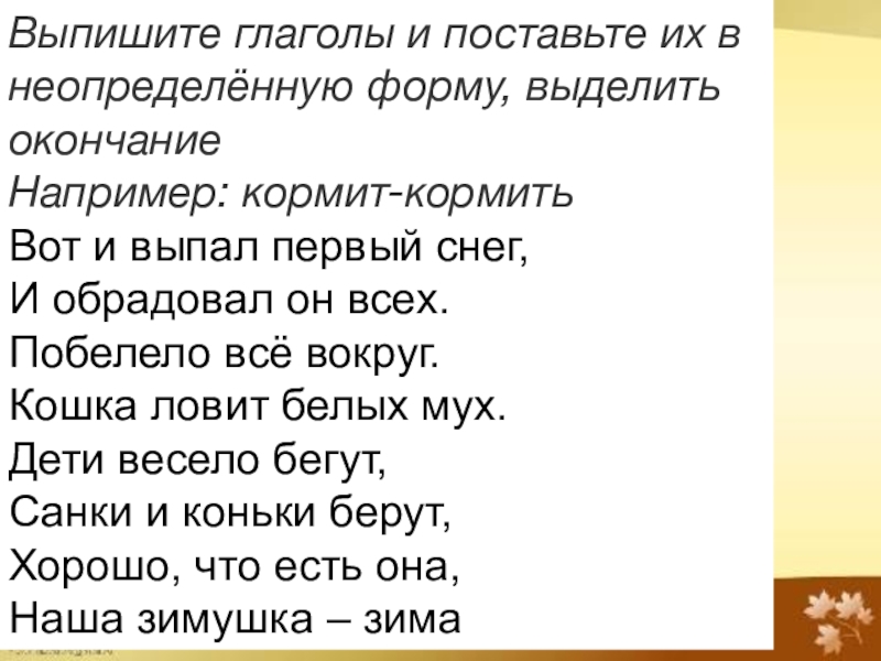 Выпишите глаголы и поставьте их в неопределённую форму, выделить окончаниеНапример: кормит-кормитьВот и выпал первый снег, И обрадовал