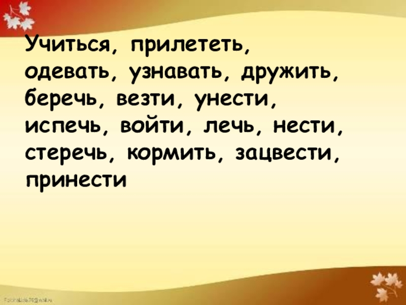 Слайд 15Учиться, прилететь, одевать, узнавать, дружить, беречь, везти, унести, испечь, войти, лечь,