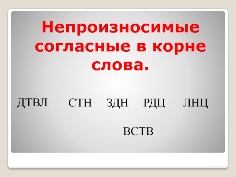 Непроизносимые согласные в корне слова.ДТВЛСТН   ЗДН   РДЦ   ЛНЦ   ВСТВ