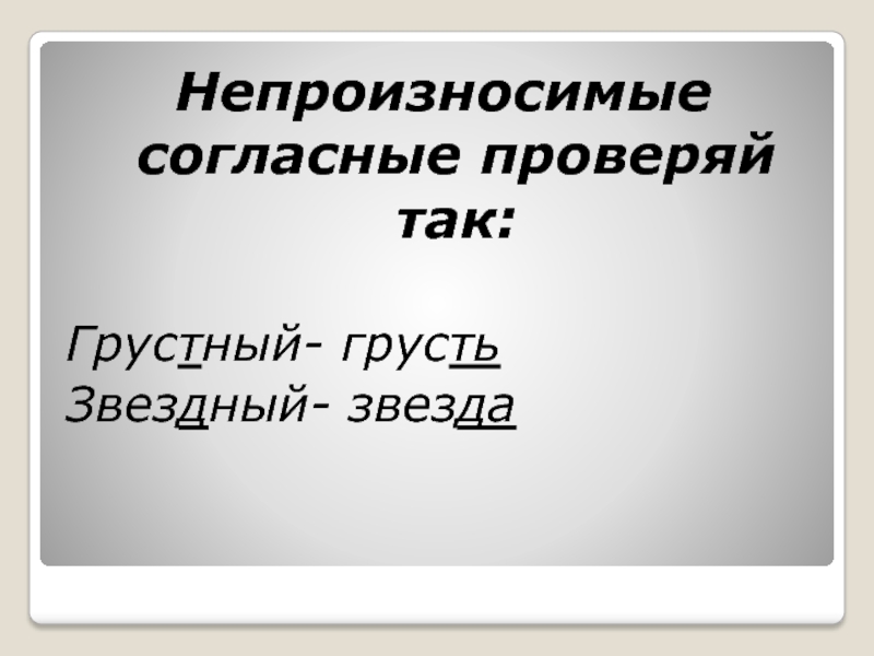 Непроизносимые согласные проверяй так: Грустный- грустьЗвездный- звезда