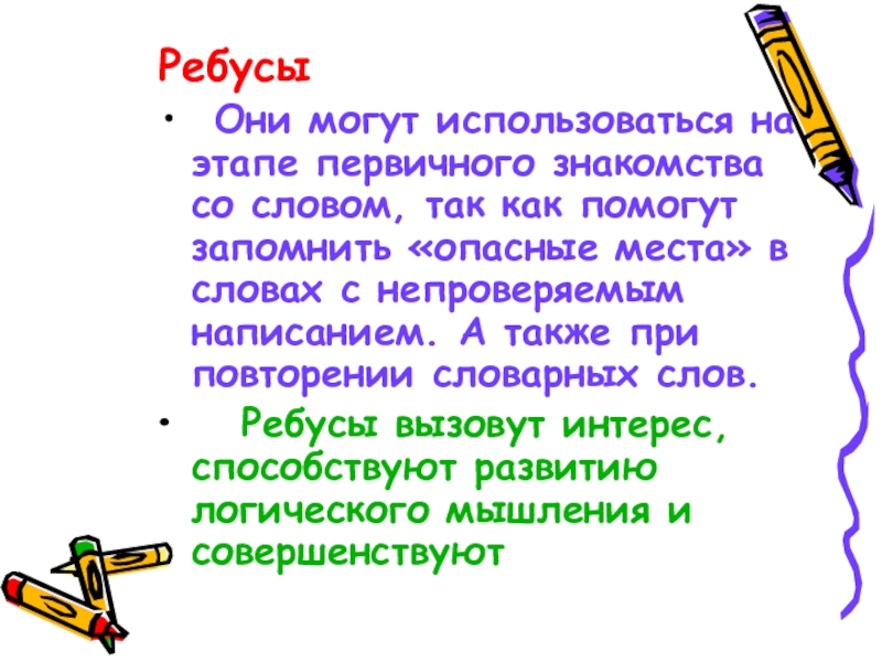 Ребусы вызовут интерес, способствуют развитию логического мышления и совершенствуют
