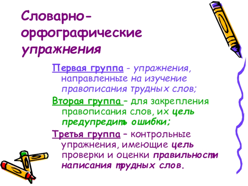 Первая группа - упражнения, направленные на изучение правописания трудных