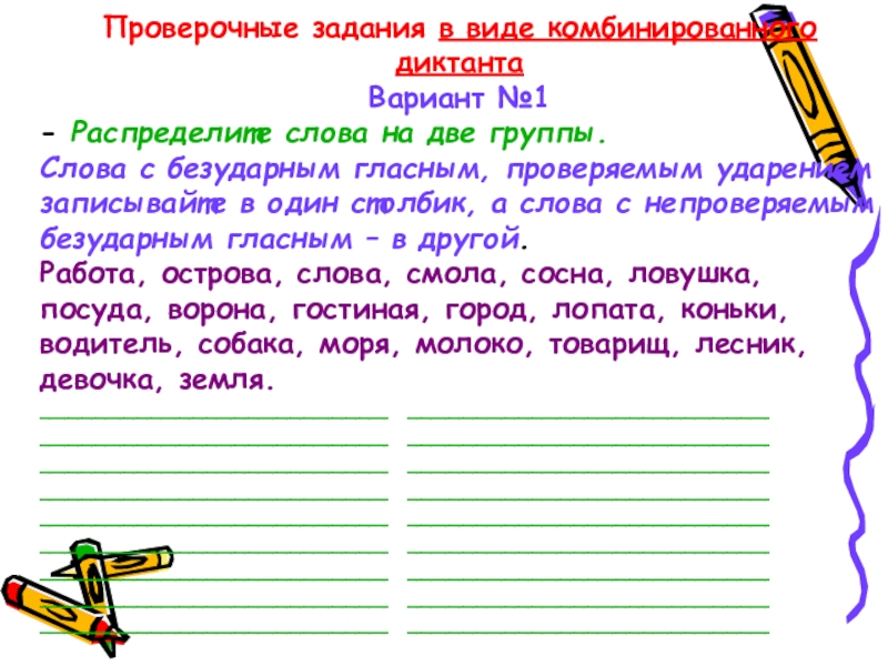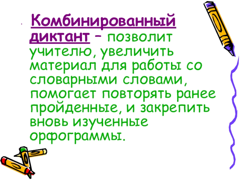 Слайд 11 Комбинированный диктант – позволит учителю, увеличить материал для работы со