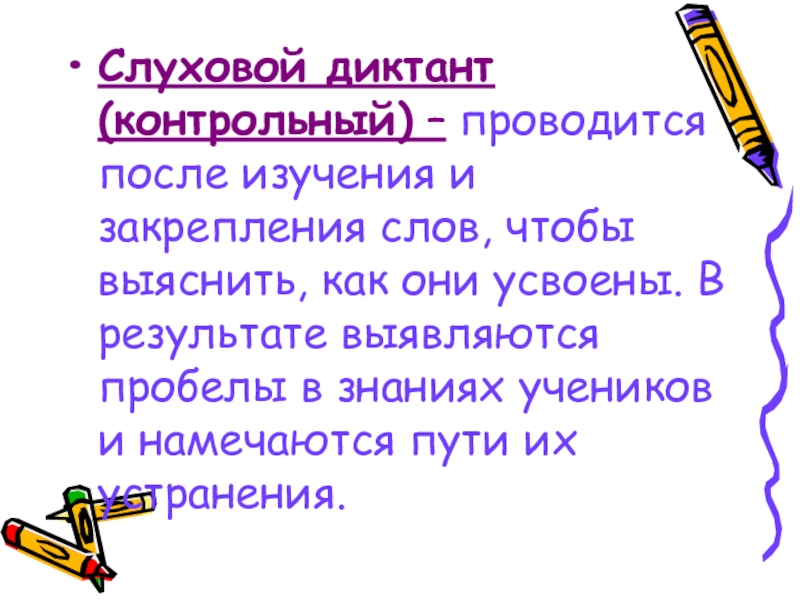 Слуховой диктант (контрольный) – проводится после изучения и закрепления слов,
