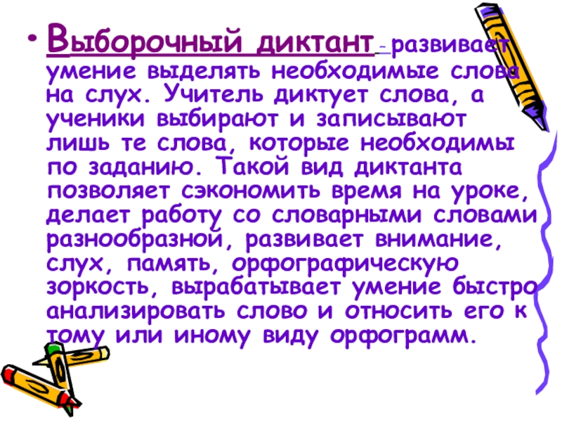 диктует слова, а ученики выбирают и записывают лишь те слова, которые необходимы по заданию. Такой вид диктанта позволяет сэкономить время на уроке, делает работу со словарными словами разнообразной, развивает внимание, слух, память, орфографическую зоркость, вырабатывает умение быстро анализировать слово и относить его к тому или иному виду орфограмм.